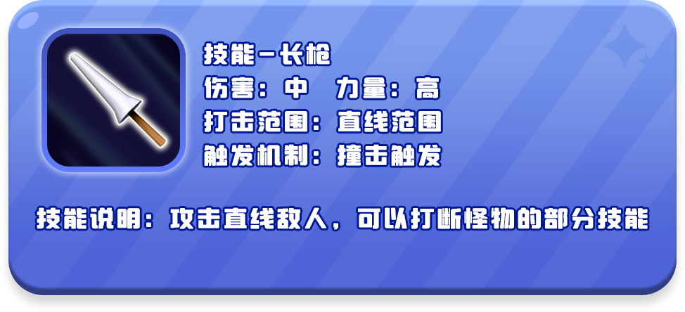 技能说明:攻击直线敌人,可以打断怪物的部分技能