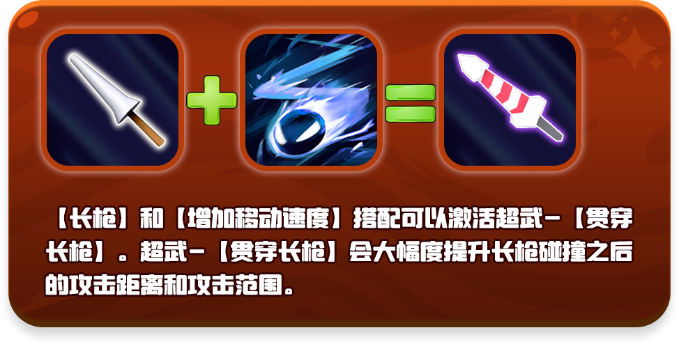 超武:【长枪】和【增加移动速度】搭配可以激活超武-【贯穿长枪】。超武-【贯穿长枪】会大幅度提升长枪碰撞之后的攻击距离和攻击范围。
